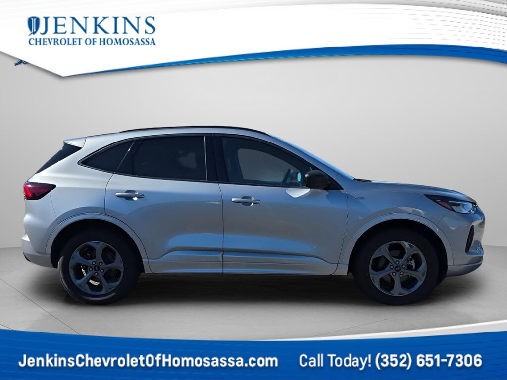 This vehicle comes equipped with Cold Weather Package (Heated Front Row Seats, Heated Sideview Mirrors, Heated Steering Wheel, and Remote Starter System), Equipment Group 300A, AWD, 3.81 Axle Ratio, 4-Wheel Disc Brakes, 6 Speakers, ABS brakes, Air Conditioning, Alloy wheels, AM/FM radio: SiriusXM, AM/FM Stereo, Auto High-beam Headlights, Automatic temperature control, Brake assist, Bumpers: body-color, Compass, Delay-off headlights, Driver door bin, Driver vanity mirror, Dual front impact airbags, Dual front side impact airbags, Electronic Stability Control, Emergency communication system: SYNC 4 911 Assist, Exterior Parking Camera Rear, FordPass Connect, Four wheel independent suspension, Front anti-roll bar, Front Bucket Seats, Front Center Armrest, Front dual zone A/C, Front reading lights, Fully automatic headlights, Illuminated entry, Knee airbag, Low tire pressure warning, Occupant sensing airbag, Outside temperature display, Overhead airbag, Overhead console, Panic alarm, Passenger door bin, Passenger vanity mirror, Power door mirrors, Power driver seat, Power Liftgate, Power steering, Power windows, Radio data system, Rear anti-roll bar, Rear reading lights, Rear seat center armrest, Rear window defroster, Rear window wiper, Remote keyless entry, Roof rack: rails only, Speed control, Speed-sensing steering, Speed-Sensitive Wipers, Split folding rear seat, Spoiler, Sport steering wheel, Steering wheel mounted audio controls, SYNC 4, Tachometer, Telescoping steering wheel, Tilt steering wheel, Traction control, Trip computer, Variably intermittent wipers, Vinyl/Cloth Front Sport Contour Bucket Seats, and Wheels: 18" Rock Metallic Painted Aluminum . Jenkins Chevrolet of Homosassa proudly serving Homosassa, Spring Hill, Hernando, Crystal River, Beverly Hills, Inverness. Just a half hour North of Buccaneer Bay. Come see the large, expansive inventory of the Jenkins Auto Group. 26/32 City/Highway MPG AWD. CARFAX One-Owner. Silver Metallic 2024 Ford Escape ST-Line AWD 8-Speed Automatic 1.5L EcoBoost